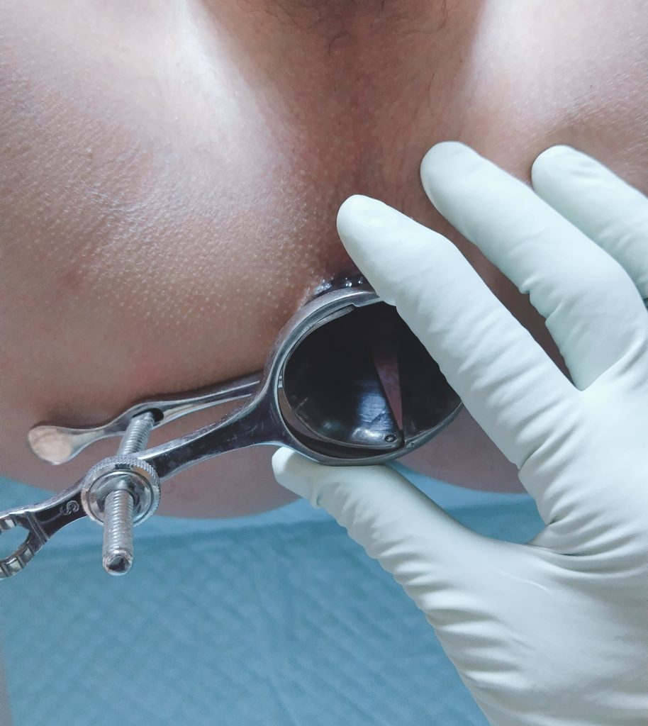 続いて前立腺の治療。私の指2本分くらいの太さのローターを挿入して刺激を与えていきます:->