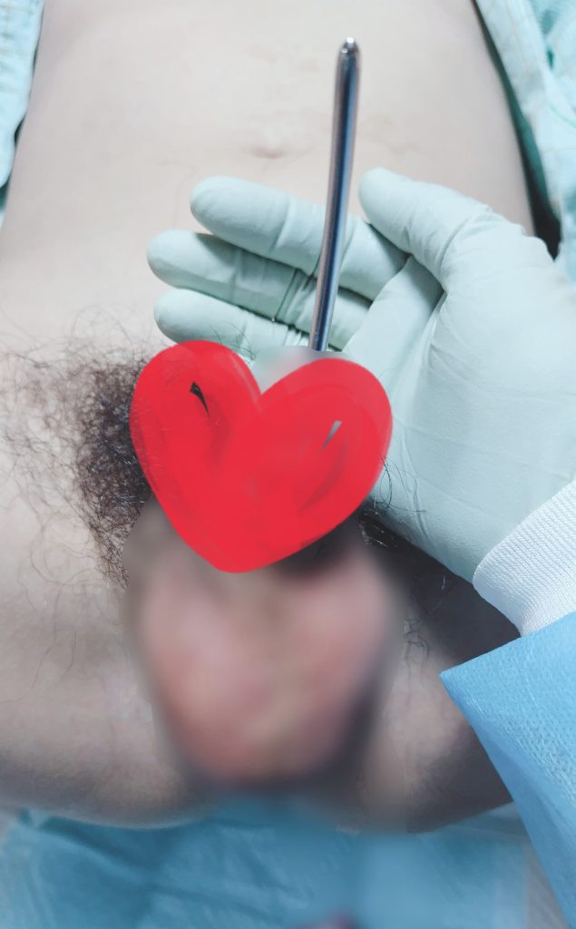 導尿処置のあと、ブジーの挿入。